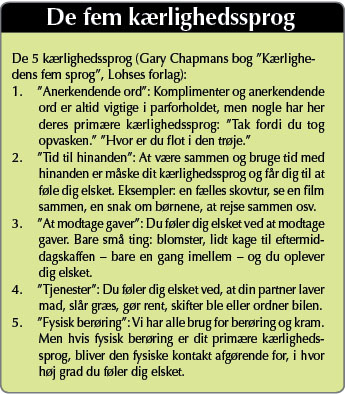 Den måde, vi forholder os over for hinanden på, er afgørende for vores trivsel og forhold. Det er vigtigt, at vi dagligt viser kærlighed over for hinanden. Men hvordan er den bedste måde at vise kærlighed på? Skal vi give blomster eller kys, bruge anerkendende ord eller klippe græsset på et uventet tidspunkt? Det er alt sammen gode handlinger. Som følge af at vi er forskellige, skal vi elskes på forskellige måder. Gary Chapman taler i sin bog Kærlighedens fem sprog om forskellige måder at vise og forstå kærlighed (se faktaboks).