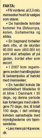 Danmark tilføjede også i 2002 – en særlig paragraf i straffeloven, som for første gang gjorde trafficking strafbart med op til otte års fængsel. Men på trods af de nye tiltag er der stadig store problemer med handel af kvinder til Danmark. I en global økonomisk recession bliver menneskehandlen også presset, men det betyder ikke, at den er på tilbagetog. Tvært-imod giver det endnu sværere vilkår for kvinderne.