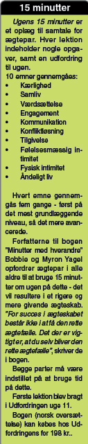 Vi har mange forskellige forestillinger om romantik. Forfatterne til 15 minutter med hverandre giver her gode forslag til intime stunder.Romantik vil ikke bare sige, at du tænder et lys eller kommer hjem med blomster. Romantik bygger også en venskabsbro, som formidler omsorg og tryghed. Man omfavner hinanden og trykker sig indtil hinanden.