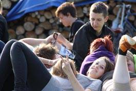 Søndbjerg Efterskoles X-klasse leger her med sigøjnerbørn i forbindelsen med udlands-turen til Ukraine, hvor de hjalp med tilbygningen ved en lokal kirke (i baggrunden). Bemærk de faldefærdige huse i sigøjnerlandsbyen.