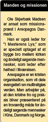 Det fortæller missionspræst Ole Skjerbæk Madsen. Han har selv været yderst skeptisk angående brug af Tarotkort, men det viser sig, at mennesker fra de nyreligiøse miljøer faktisk kommer til tro på Jesus i samtalen om Tarottens symboler. Udfordringen har mødt Ole Skjerbæk Madsen til en snak om sit liv og sin mission både i og uden for New Age-miljøet. Ole Skjerbæk har i dag skruet lidt ned for selviscenesættelsen. Den lange hvide kjortel, som han så ofte fører sig frem med, er skiftet ud med en spraglet skjorte, beige bukser og løbesko i samme farve.