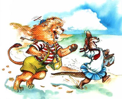 Wow! skreg de. Men ingen kunne stoppe dem, mens de rullede hurtigere og hurtigere ned ad bakken som en kæmpe kulørt bold. Og BLOP så landede de med hovederne nede i sandet.