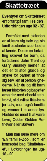 I sidste uge sluttede eventyret om skattetræet. Fire venner med fire forskellige personligheder havde brug for hinanden for at finde skatten. Med et sidste ord fra forfatterne får du nu hjælp til at finde din families primære personligheder.Vi håber, at du og dine små har nydt fortællingen om Skattetræet. Som alle forfattere håber vi også, at den har været underholdende. Men vi håber også mere end noget andet, at den har været opmuntrende ja, oven i købet udfordrende.
