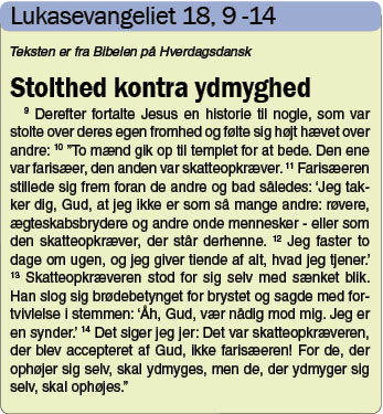 Alligevel siger Jesus i søndagens tekst, at det er tolderen, der er retfærdig i Guds øjne. Ved første øjekast lyder det jo ikke helt forkert. Tolderen var jo ærlig og satte sig ikke over andre mennesker. Farisæeren derimod pralede af sine handlinger og troede, at de gjorde ham til et bedre menneske.