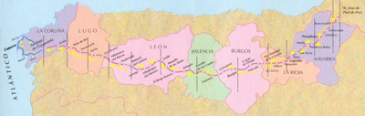 Overnatningsstederne på Caminoen var: Saint Jean Pied de Port, Roncevalles, Zubiri, Pamplona, Uterga, Lorca, Ayegui, Los Arcos, Legrono, Ventosa, Santo Domingo de la Calzada, Belorado, Villa Franca de Ora, Atapuerca, Burgos, Hornillos, Castrojeritz, Fromista, Carrion de los Condes, Terradillos, Sahagun, El Burgo Ranero, Mansila de las Mulas, Leon, Mazarife, Santibanes, Astorga, Rabanal, Acebo, Ponferrada, Villafranca del Bierzo, Vaga de Valcarse, O Cebreiro, Triacastella, Sarria, Portomarin, Ligonde, Melide, Arzua, Arce og Santiago.