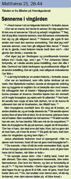 – Men lignelsen fortæller os også noget om vores position og situation i forhold til Gud og til hinanden. Vi er ikke bare skabt som en flok smukke dyr, men som Guds afglans og billede. Vi er privilegerede, og Gud udruster os og sørger for alt, hvad vi har brug for i den vingård, han har betroet os: Der var en vingårdsejer, som plantede en vingård og satte et gærde om den, og han gravede en perse i den og byggede et vagttårn.