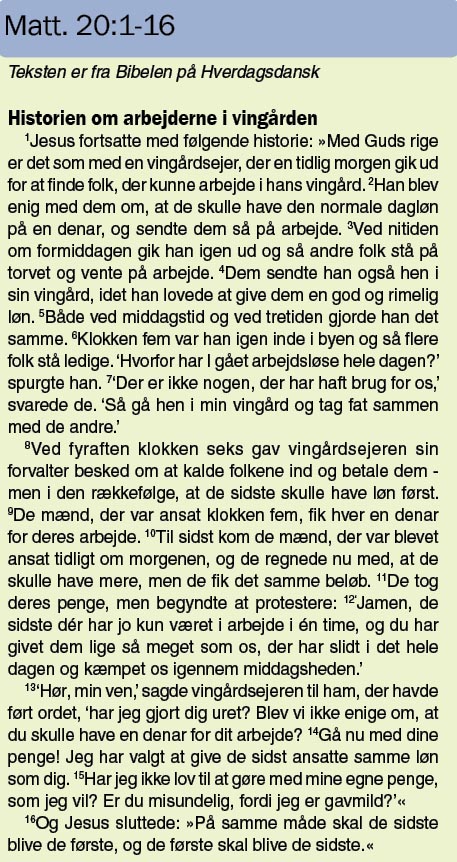I dagens tekst blev ingen snydt. Alle fik tilbudt arbejde, alle tog imod arbejdet. Der stod ingen arbejdsløse, da dagen var gået.