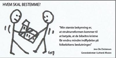 – Min største bekymring går på, om strukturreformen kommer til at betyde en yderligere udfasning af de bibeltro grupperinger fra kirkens beslutningsprocesser. I dag lever klassisk kristentro i folkekirken på en måde i lokale lommer, sådan lidt i ly af det almindelige anarki. Med tydeligere styring kan det blive vanskeligere, forklarer Jens Ole Christensen.