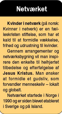 Kvinder i Netværk startede i Norge i 1990, og visionen bag netværket er at formidle vækkelse, frihed og udrustning til kvinder. Sigrun Fryd og Bente Lillelund fra Assentoft Frikirke ønsker, at vi i Danmark får del i den fornyelse, mange oplever i Norge. Derfor har de taget initiativet til denne inspirationsdag.