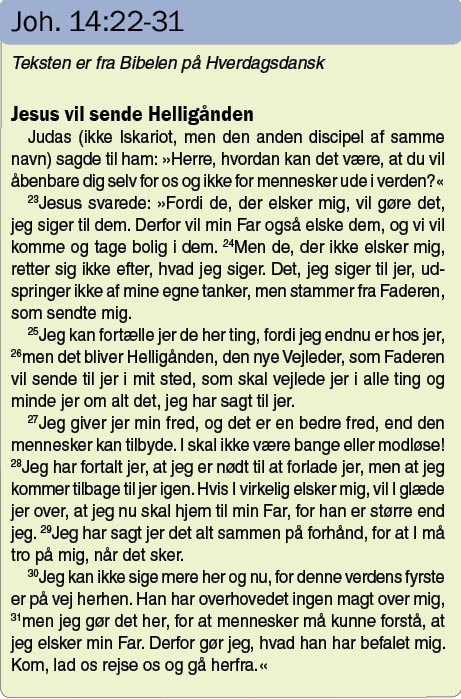 I Joh. 14,25 siger Jesus: Sådan har jeg talt til jer, mens jeg endnu var hos jer. M e n Talsmanden, Helligånden, som Faderen vil sende i mit navn, Han skal lære jer alt og minde jer om alt, hvad jeg har sagt til jer.