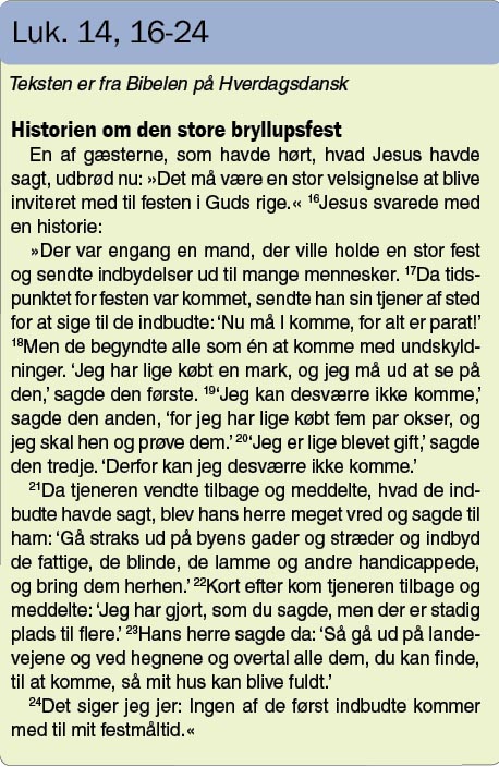 Lignelsen om indbydelsen til det store festmåltid kan misforstås på (mindst) to måder. Dels kan vi drage forhastede konklusioner om, hvem der er den primære strategiske målgruppe for kirkens mission. Dels kan vi springe konteksten de første 15 vers i kapitel 14 over.