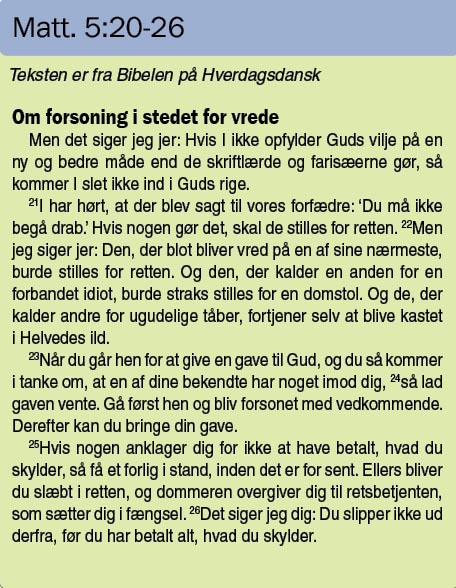 Alligevel skal man midt i dette klimaks søge at blive forliget med sit medmenneske, hvor ubelejligt og besværligt det end er. Det gælder ikke bare, når jeg har gjort noget galt, men også når jeg føler, at det er den anden, der har såret mig.