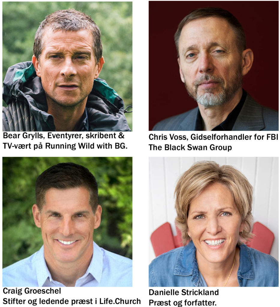 Talerne i de to danske GLS’er ses herover. Blandt dem er Bear Grylls, kendt fra tv-serien ”Running wild with Bear Grylls. Og der er 11 andre top-talere.