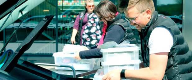 De frivillige får del i overskudsmad fra håndboldklubben BSV’s sponsormiddage, når de spiller på hjemmebane i Jysk Arena.