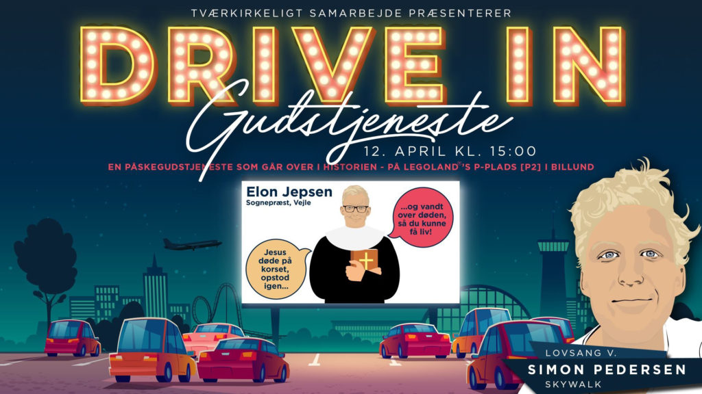 Nu holdes der en fælleskirkelig Drive-In gudstjeneste påskesøndags i Billund ved LEGOLAND på P2. (Se plakaten herover.)