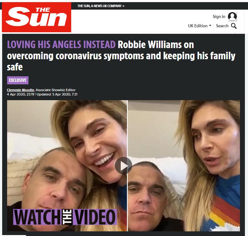 Til den engelske søndagsavis Sun on Sunday fortæller Robbie Williams, at han isolerede sig selv i en Air BnB i Los Angeles efter en tur i Australien i sidste måned. Han følte sig syg og ville ikke inficere sin kone og deres børn.
