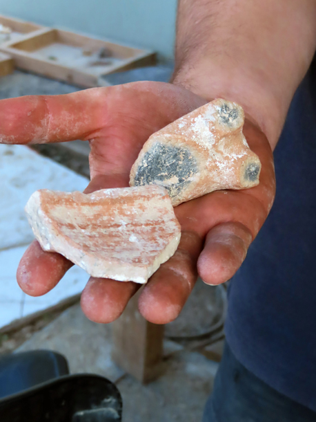 Han leder os på vejen til barakken med udstyr og små fund. De fortæller ofte lige så meget som de store mure, der er bygget af store herskere. Fra en pose tager Silverberg noget keramik.