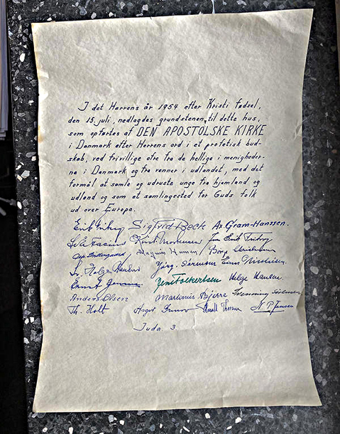 Da man på Højskolen Acts Academy i Kolding (tidligere kaldet Apostolsk Højskole) var i gang med at udskifte vinduerne i spisesalen, fandt en af håndværkerne en flaske, der var muret ind i fundament