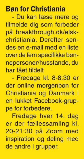 Bøn i 50 års fødselsdagsgave til Christiania Betina Enemark fra BreakThrough Danmark og John Andersen, præst i Christianiakirken, er gået sammen om at bede for fristaden. Indland Af Kirstine Høj 24. sep. 2021/38 I 50 års fødselsdagsgave til Christiania er BreakThrough Danmark oEr du allerede abonnent? Log ind her. Denne artikel er gratis. Opret en gratis konto og få flere af Udfordringens bedste artikler direkte i din indbakke. E-mail Kodeord Eller bliv abonnent og få ubegrænset adgang til alle artikler. Del