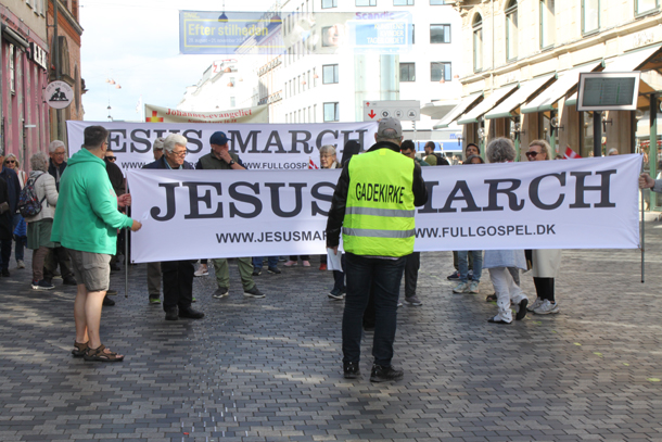 Lørdag den 18. september fra kl. 12 var 50-75 mennesker samlet til årets Jesus-march i København. Marchen var arrangeret af den tværkirkelige forening, Full Gospel Business. Med Dannebrogsflag, lovsang, slagord og lovprisning bevægede den tværkirkelige march sig gennem Københavns Indre By.