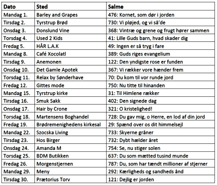 I Christiansfeld har Tyrstrup Kirke udviklet en tradition med salmesang i butikkerne i ”kulturarvsmåneden”.