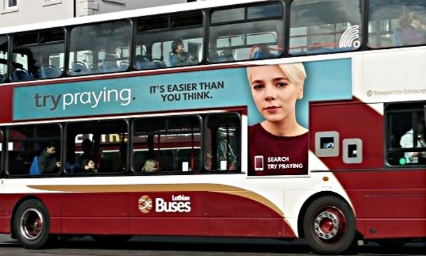 På busserne i Edinburgh stod der ”try praying”, prøv at bede! Det var en kampagne med bannere og plakater, som blev bakket op af byens kirker. Der var info-materialer og tilbud om kurser i kirkernes forhaller. (Se: trypraying.org).