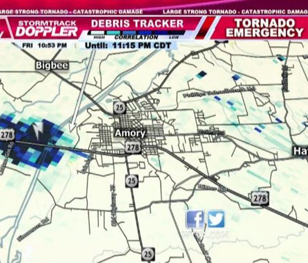 USA’s nationale vejrtjeneste havde varslet en type EF-4-tornado, dvs. at man kunne forvente altødelæggende vindstød på op mod 300 km i timen i et bredt bælte gennem Mississippi. Meteorologen Matt Laubhan fra WTVA var dybt rystet, da han beskrev monstertornadoens mulige bane direkte mod Amory den 27. marts.