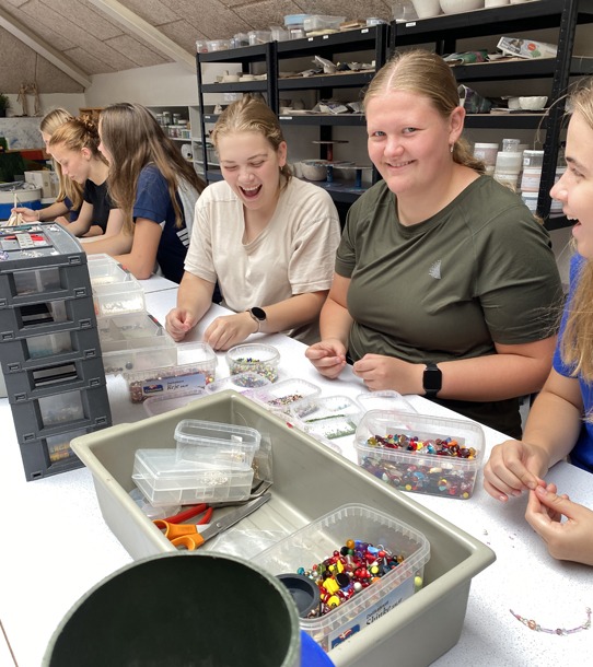 Når man træder ind i det kreative lokale møder man rolig musik fra en lille højttaler i hjørnet. Rundt om bordet er der koncentration fra eleverne, der i dag er begyndt på at lave smykker. Perler, pailletter og farverige sten bliver sat på tråde og mange forskellige smykker begynder at tage form. Her er der hyggeligt og roligt – et godt pusterum midt i dagligdagen, hvor man kan koble fra og bare lave noget, som både er smukt og hyggeligt.