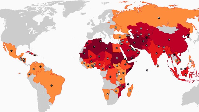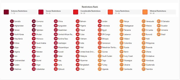 I alt identificerer rapporten 15 lande med ”ekstreme restriktioner”. I kategorien lige under dette, nemlig lande med ”alvorlige restriktioner”, nævnes 18 nationer.