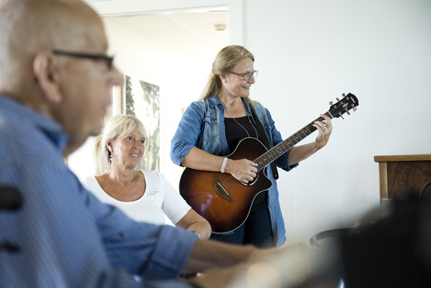 ”De tilbagemeldinger, jeg får, når jeg har været på hospice, er, at folk oplever en kærlighed og forståelse for deres situation. De oplever fred i nogle situationer og relationer, som er svære. Hele samarbejdet med de frivillige og de ansatte gør oplevelsen til en helhed. Jeg oplever, at jeg bliver favnet, så snart jeg kommer ind. Jeg synger noget af det, de kender: ”Jeg ved en lærkerede” og nogle gængse danske sange blandet med mine egne sange. Der sker noget i rummet, en atmosfære af kærlighed og fred. Det er jeg meget taknemmelig for.”
