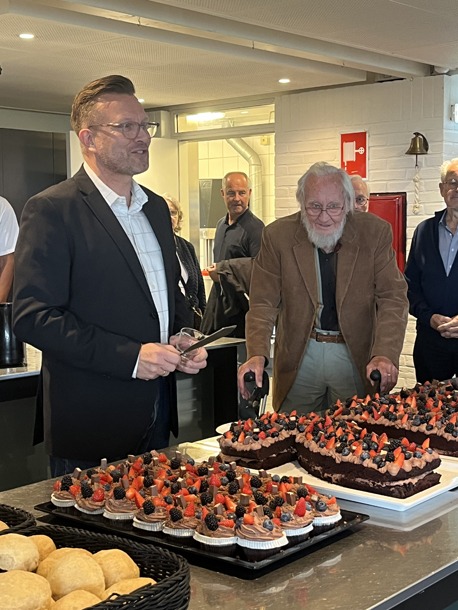 Der var naturligvis også inviteret til jubilæumskage, og her stod skolens forstander klar til at skære for sammen med en af højskolens elever fra allerførste årgang i 1955, Jakob Jakobsen.