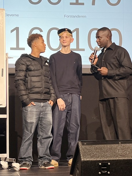 Det blev en meget festlig time, hvor både de medvirkende og publikum var meget engagerede. Carolyne og Melvin havde en ping-pong med hinanden, som gjorde, at alle fik rørt lattermusklerne – og i tæt løb med forstanderen, løb efterskoleeleverne med sejren.