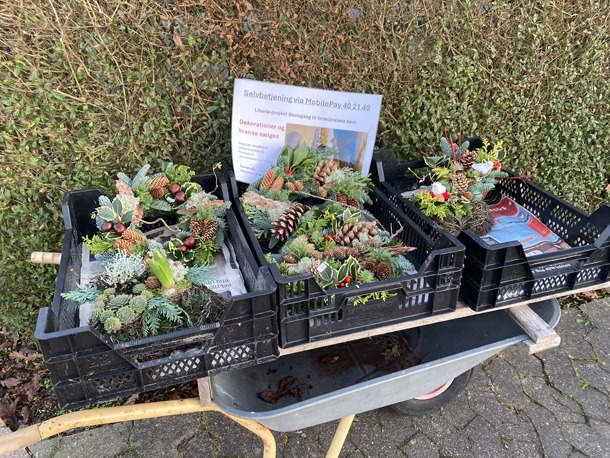 Allerede ude ved fortovet på Amerikavej i Gjern møder man velgørenhedsprojektet, idet en selvbetjeningsbod med kranse og dekorationer på en trillebør er forsynet med teksten ’Liberia-projekt Skolegang til forældreløse børn’ – og et MobilePay-nummer. I indkørslen står bilen parkeret, for også hele den lange carport er fyldt med juledekorationer.