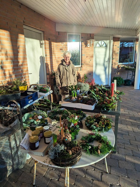 ”Tiden her op til jul er mere rolig,” siger Else Marie med henvisning til det store arbejde, hun havde i foråret, hvor hun hver dag måtte slæbe kasse efter kasse med tomatplanter ud af huset om morgenen – og ind igen om aftenen, fordi stiklingerne ikke tåler temperaturer under 8-10 grader. Og der skulle naturligvis også laves dekorationer op til påske. Men det glæder hende, at der hele tiden kommer penge ind til projektet. Det er det vigtigste. Samtidig giver arbejdet hende god motion, så hun ikke har brug for at gå i fitnesscenter. Og de mindre udgifter, hun har til fx lys og andet til dekorationerne, betaler hun gladeligt selv, ”for jeg bruger jo alligevel ikke mine penge til golf,” som hun siger.