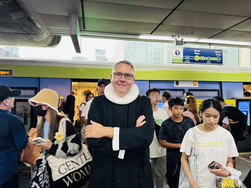 Der er ofte 30 grader i Bangkok, alligevel tager Nicolaj gerne sin danske uld-præstekjole på