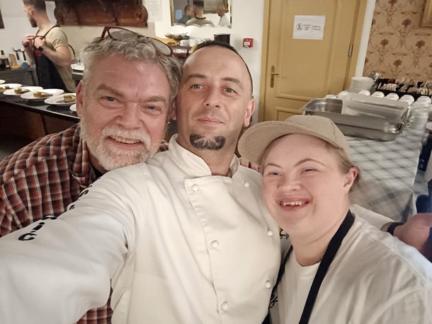 Fra venstre ses Erik Hviid, kokken Thomislav, som var Saras coach, og Sara selv, da hun i 2023 deltog i Masterchef-konkurrencen Cupid’s Spoon i Kroation. Erik Hviid fortæller, at Sarah lavede rødbederisotto med kyllingerulle og ærtecreme, peberfrugt og krydderier samt rødbede chips.