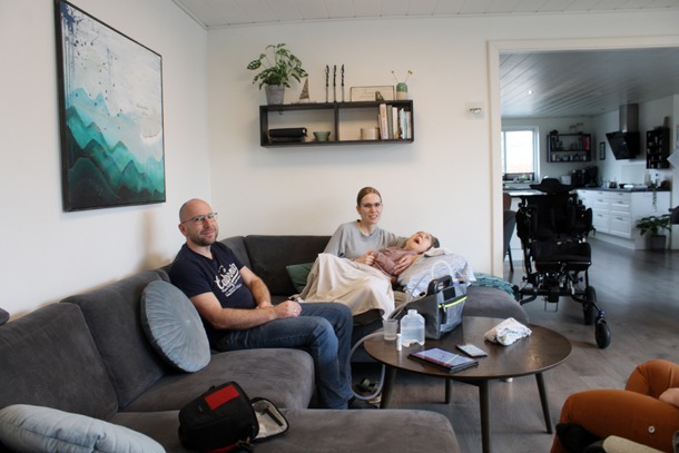 Kristina siger også til Jonas: ”Du er så god til at fortælle, jeg bliver meget grådlabil – kan vi tage billederne først?” Det gør vi. Deres multihandicappede datter Rebekka er også i stuen, hun halvt ligger og halvt sidder i sofaen sammen med Jonas og Kristina. Jonas siger med varme i stemmen og et stort smil henvendt til Rebekka: ”Hun kan sagtens nyde et roligt samtalerum, som vi har her. Nogle gange sender hun et stort smil, når hun er tryg og godt tilpas. Lyset er dæmpet, for på den måde, at skærme hende for stimuli.”