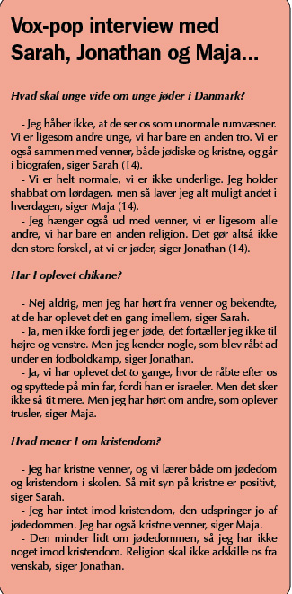 Udfordringen har talt med tre 14-årige elever fra en jødisk skole, Sarah, Jonathan og Maja, som fortæller, hvordan det er at være ung jøde i Danmark.