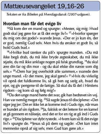 Jesus udfordrer manden, og han udfordrer os, der gerne er optaget af egne dispositioner. Den rige mand er dog samtidig optaget af det evige liv. Hvad med os? Hvis vi overhovedet taler om det evige liv, er det så ikke som en slags præmie, der udbetales, når vi er færdige med at leve vores liv her på jorden? Jesus har vi så fået henvist til det hinsides, hvor han passende kan sidde og vente på os, mens vi gør os færdige med vores projekter. Vi sørger godt for os selv.