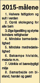 – Mange danskere kender ikke FNs 2015-mål og heller ikke kirkernes indsats på området. Det vil vi gerne gøre dem opmærksomme på i kampagnen. Gennem vores 29 medlemsorganisationer og deres samarbejdspartnere i 3. verden støtter DMR-U en lang række projekter, som er med til at opfylde målene, og det fortjener at blive kendt, siger Uffe Torm, der er leder af Dansk Missionsråds Udviklingsafdeling.